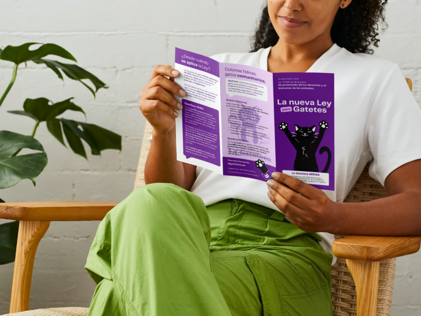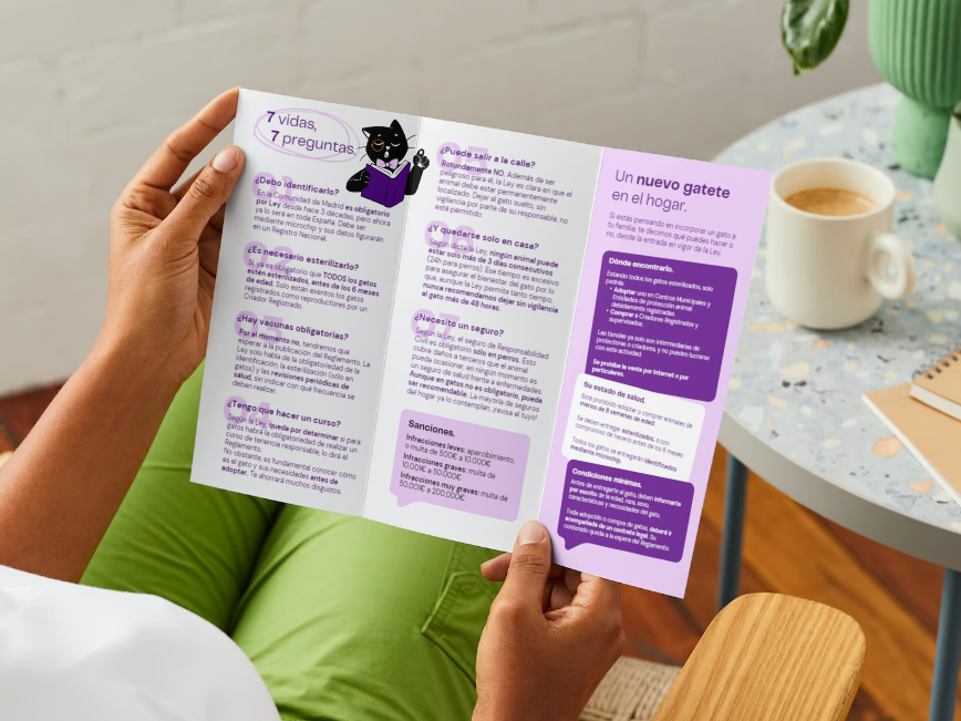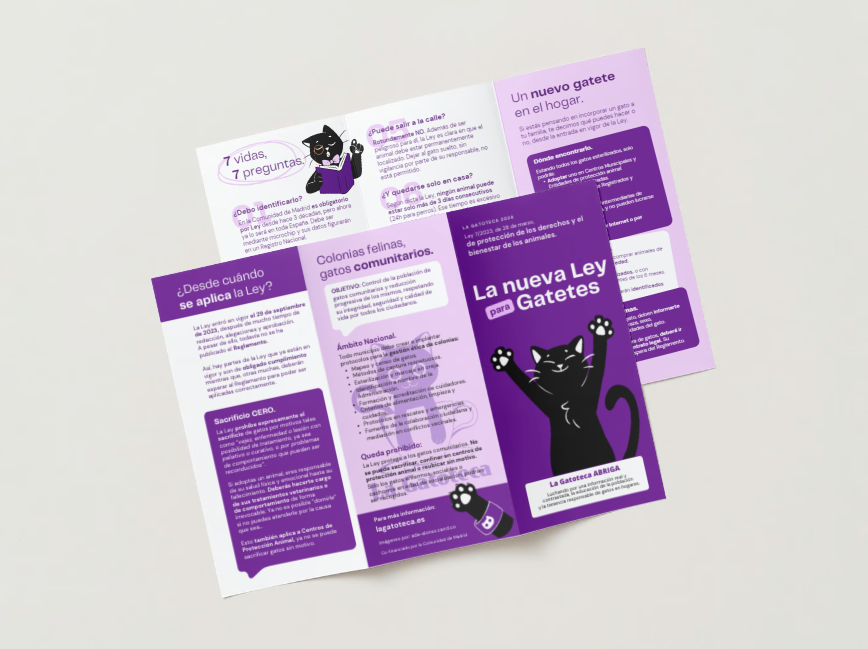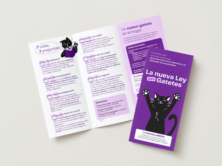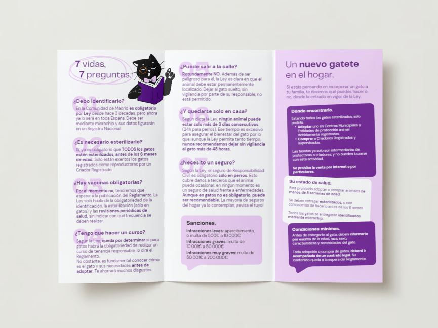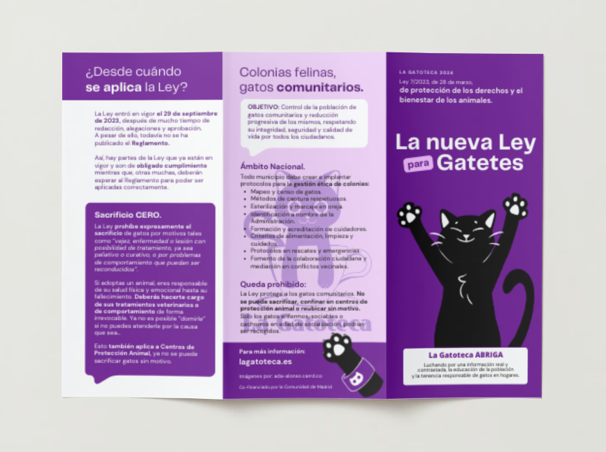 Tríptico para impresión A4 a doble cara y todo color. En él explicamos cómo afecta la nueva Ley de protección de los derechos y el bienestar de los animales, a los gatos concretamente.